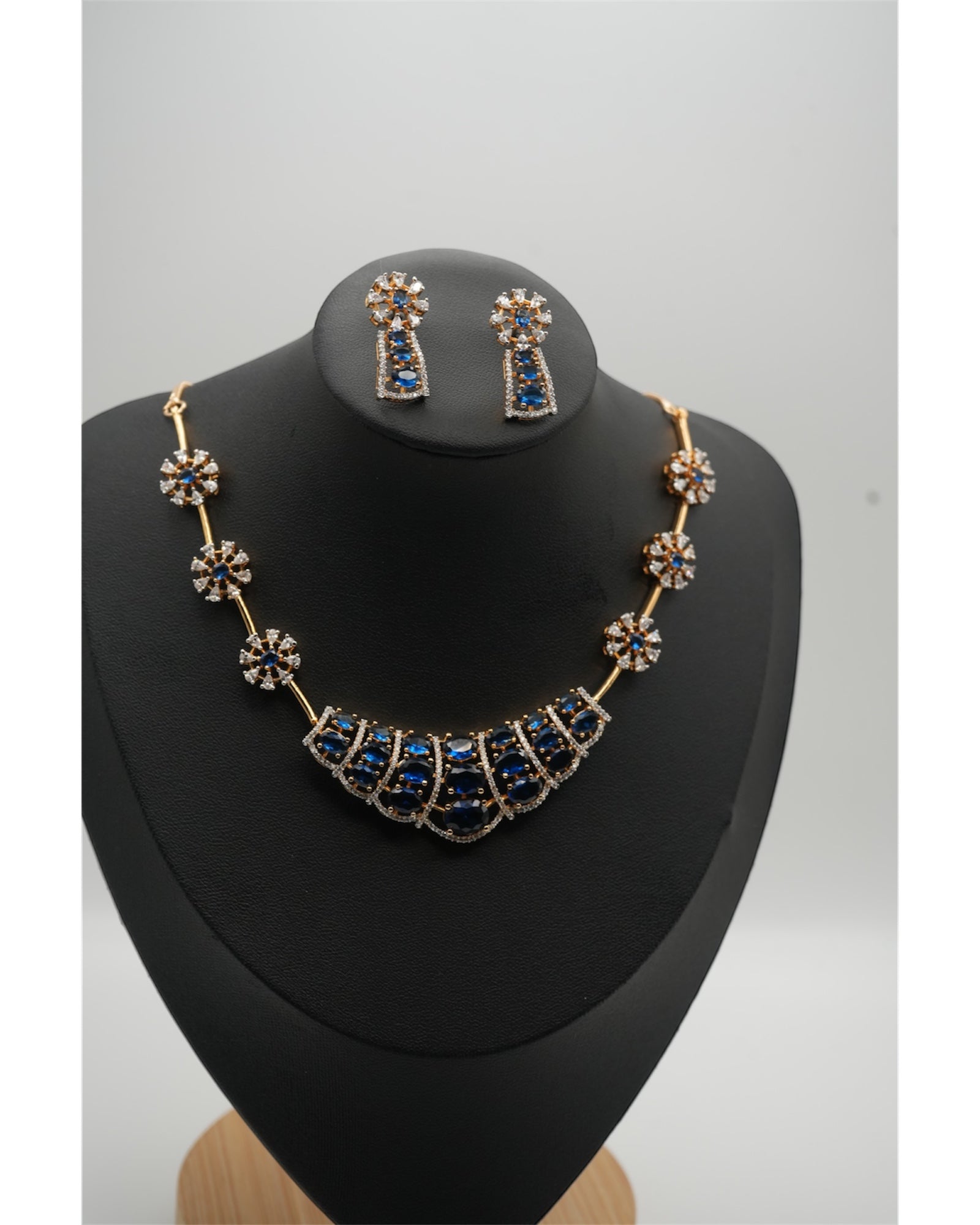 This opulent necklace features a striking central design of multiple rows of deep blue sapphire-toned stones, elegantly set and framed by dazzling clear accents. The golden chain is adorned with charming, flower-like clusters of coordinating blue and clear stones. The ensemble is completed by matching drop earrings that echo the necklace's rich blue gems and sparkling surrounds. This magnificent set is perfect for adding a touch of regal elegance and vibrant color to any attire.