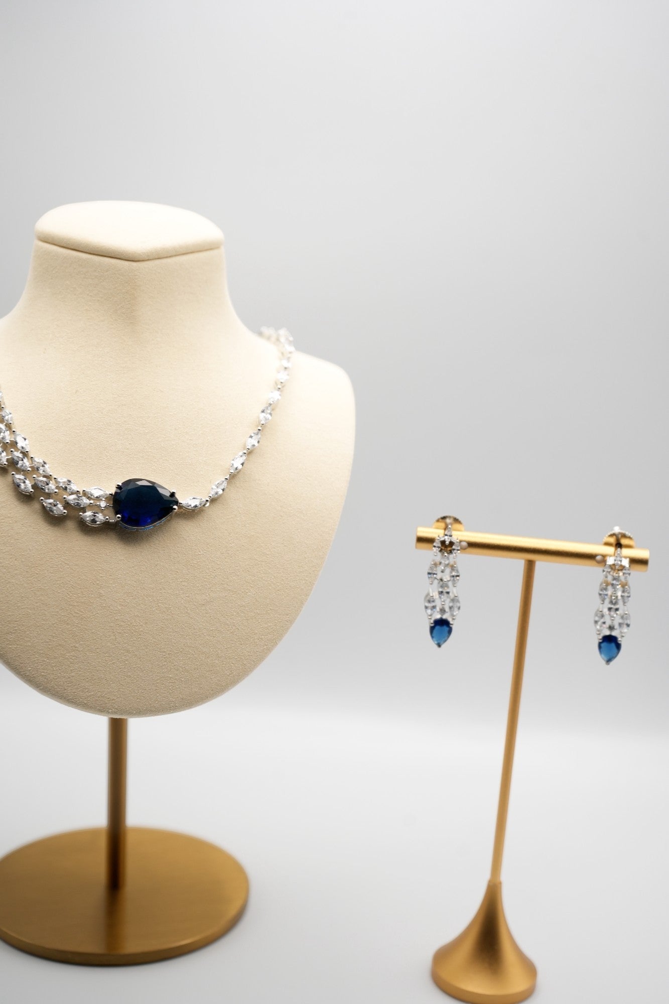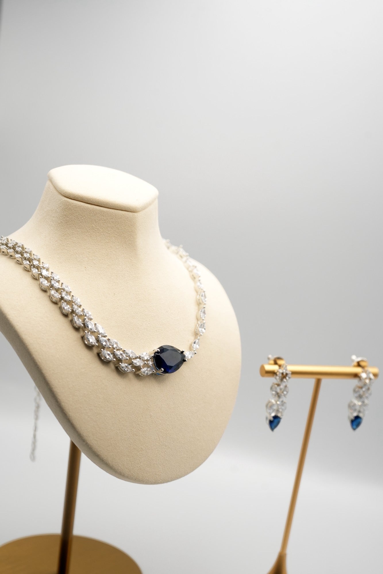 Indulge in timeless elegance Necklace & Earring Set. This exquisite ensemble features a delicate yet dazzling arrangement of brilliant-cut AD leading to a vibrant, pear-shaped emerald centerpiece in the necklace. The matching earrings mirror this sophisticated design, showcasing cascading Stones that culminate in a smaller, pear-shaped emerald. Perfect for adding a touch of refined glamour and vibrant color to any special occasion.