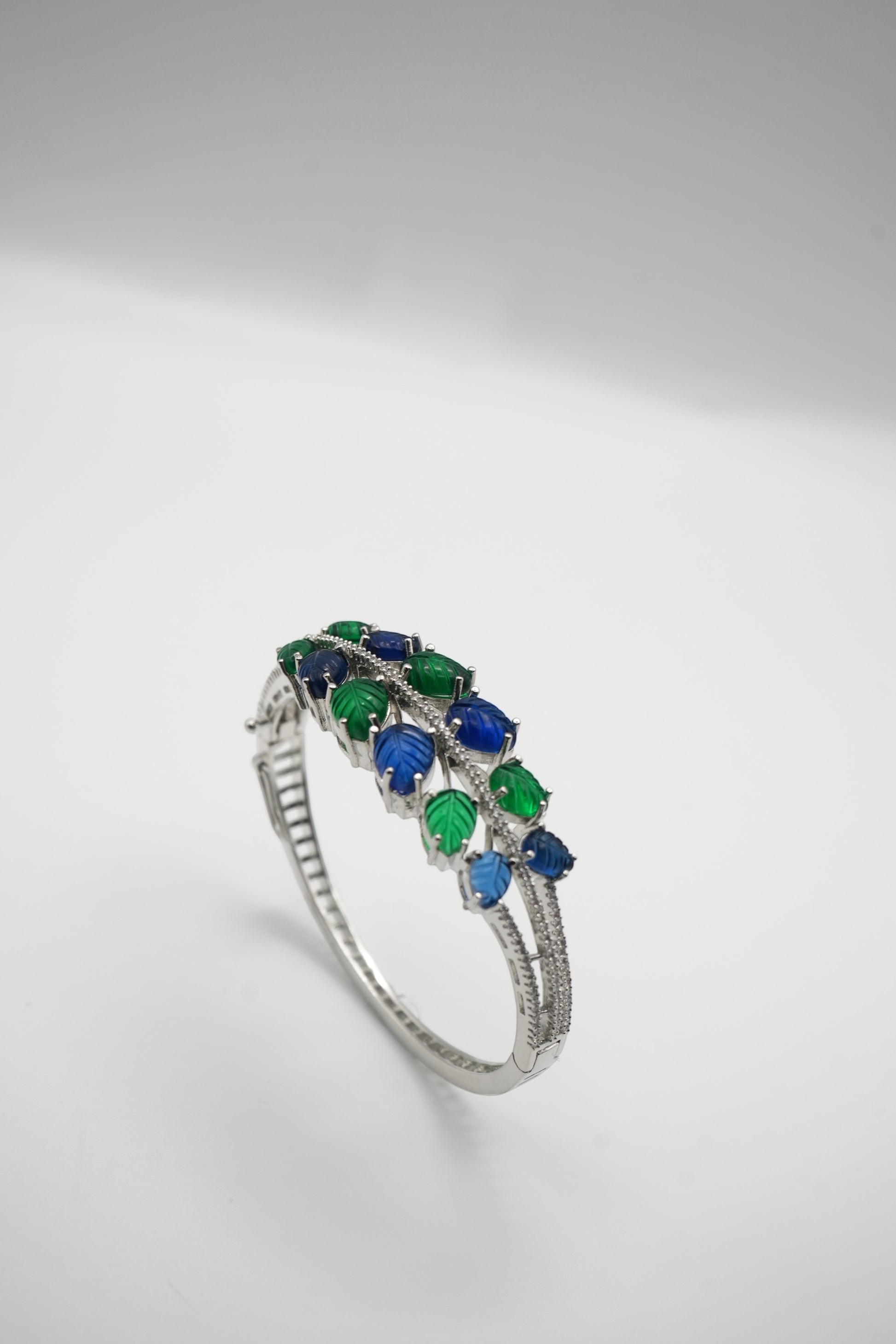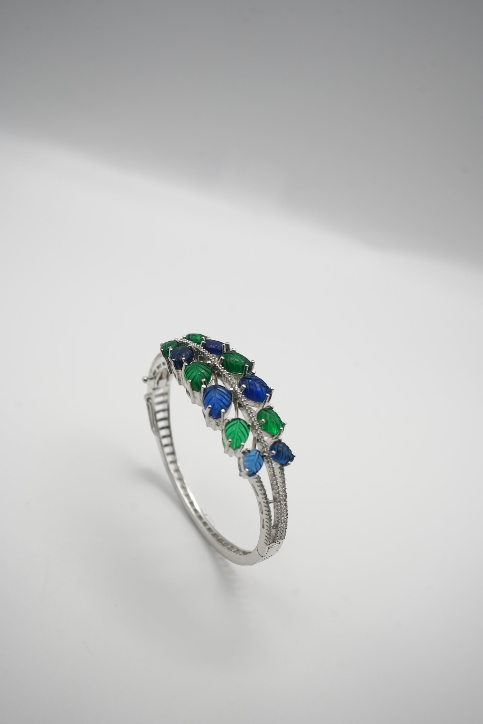 Introducing the "Sapphire & Emerald Dream" bangle, a captivating piece that beautifully blends the rich hues of sapphire and emerald with the dazzling sparkle of crystals. This bracelet features a unique, eye-catching design, making it a perfect accessory for adding a touch of glamour and sophistication to any outfit.
