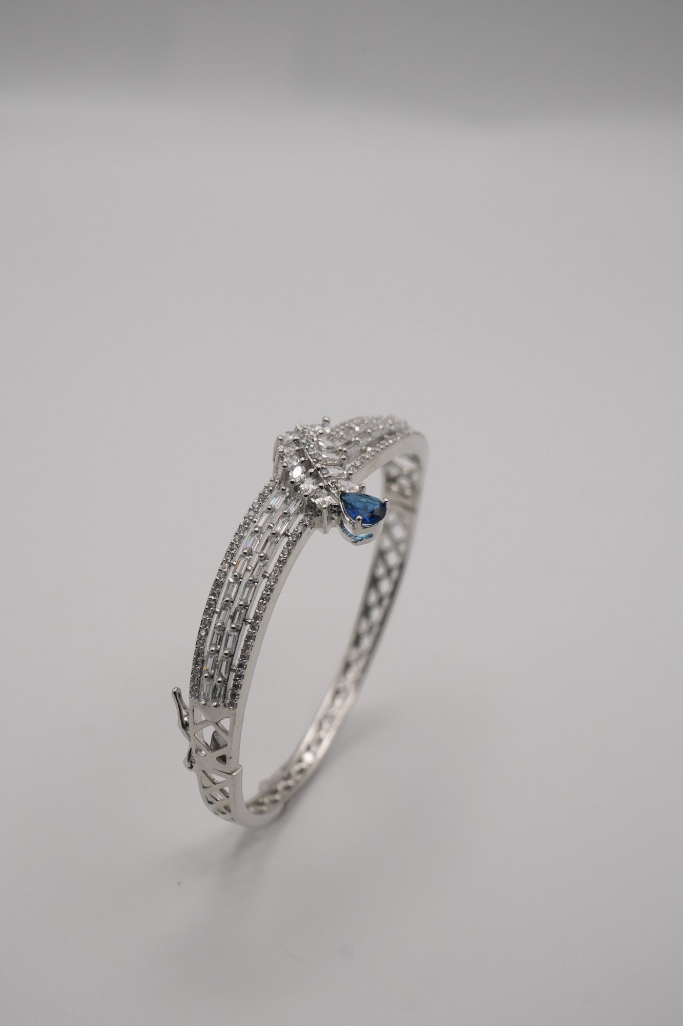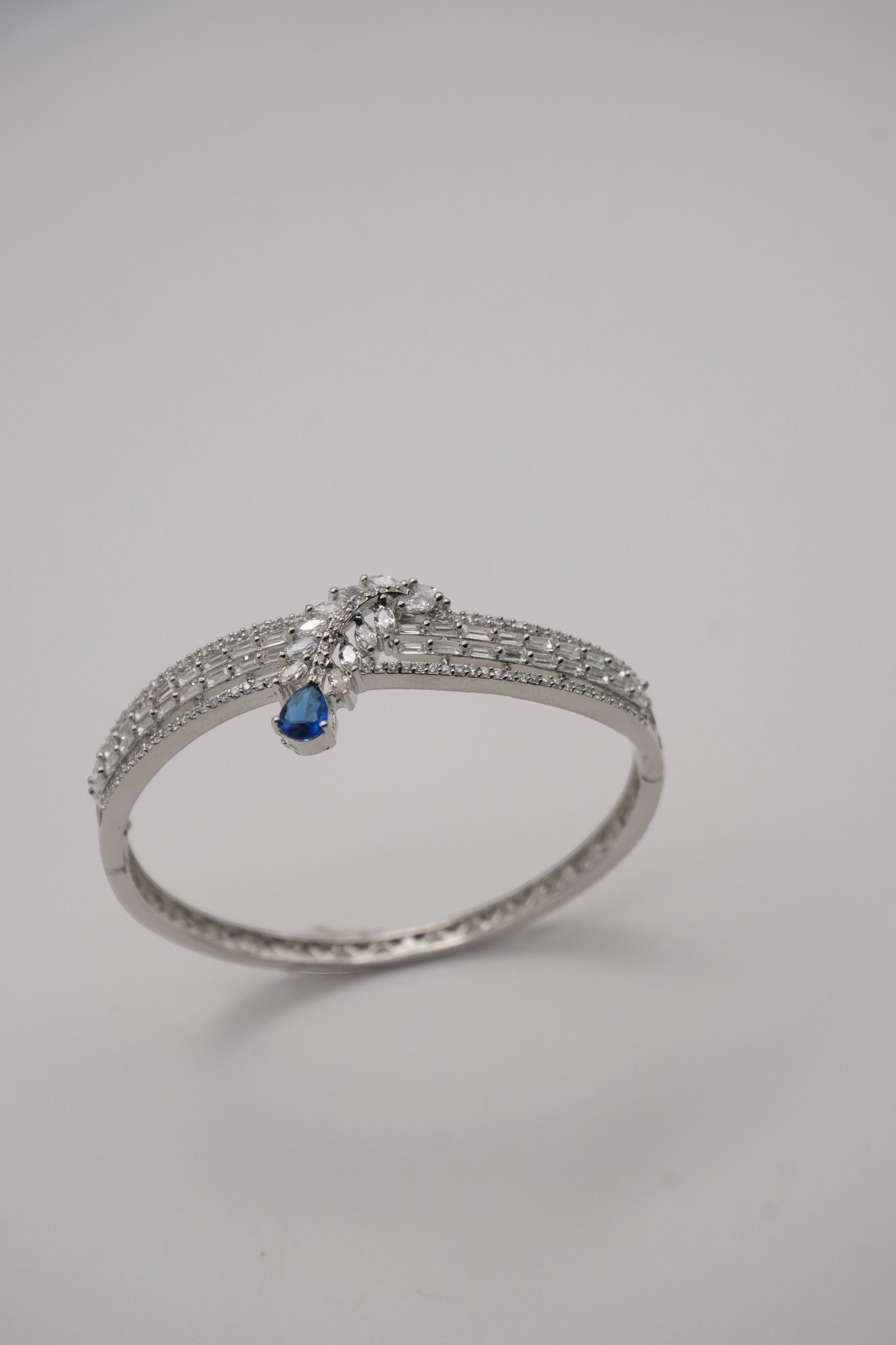 Adorn your wrist with the captivating elegance of the "Azure Cascade" Bangle Bracelet. This exquisite piece features a unique interwoven design of sparkling crystal bands and delicate baguette-cut clear crystals, all accented by a striking blue teardrop gemstone. Set in a brilliant silver-toned finish, this bangle is perfect for adding a touch of contemporary glamour and vibrant color to any ensemble.