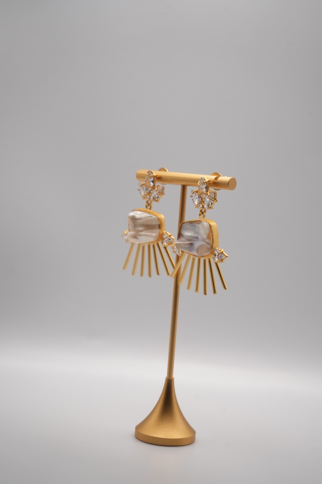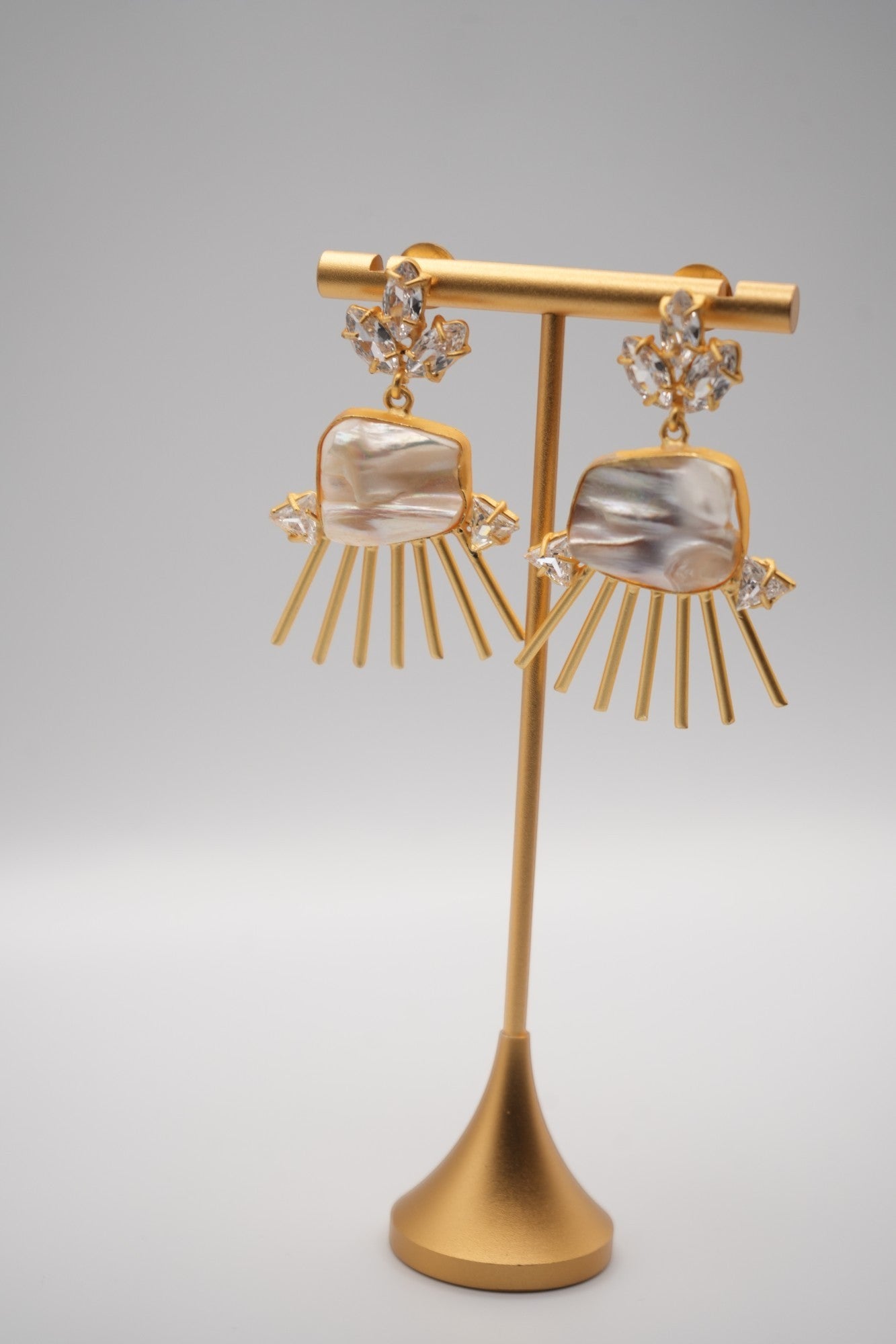 Illuminate your style with the captivating "Solar Flare" Earrings. These unique earrings feature the luminous beauty of Keshi pearls at their center, radiating outwards with bursts of sparkling crystals and sleek gold-toned rays. Inspired by the brilliance of the sun, these earrings are a statement piece that adds a touch of modern glamour and artistic flair to any look.