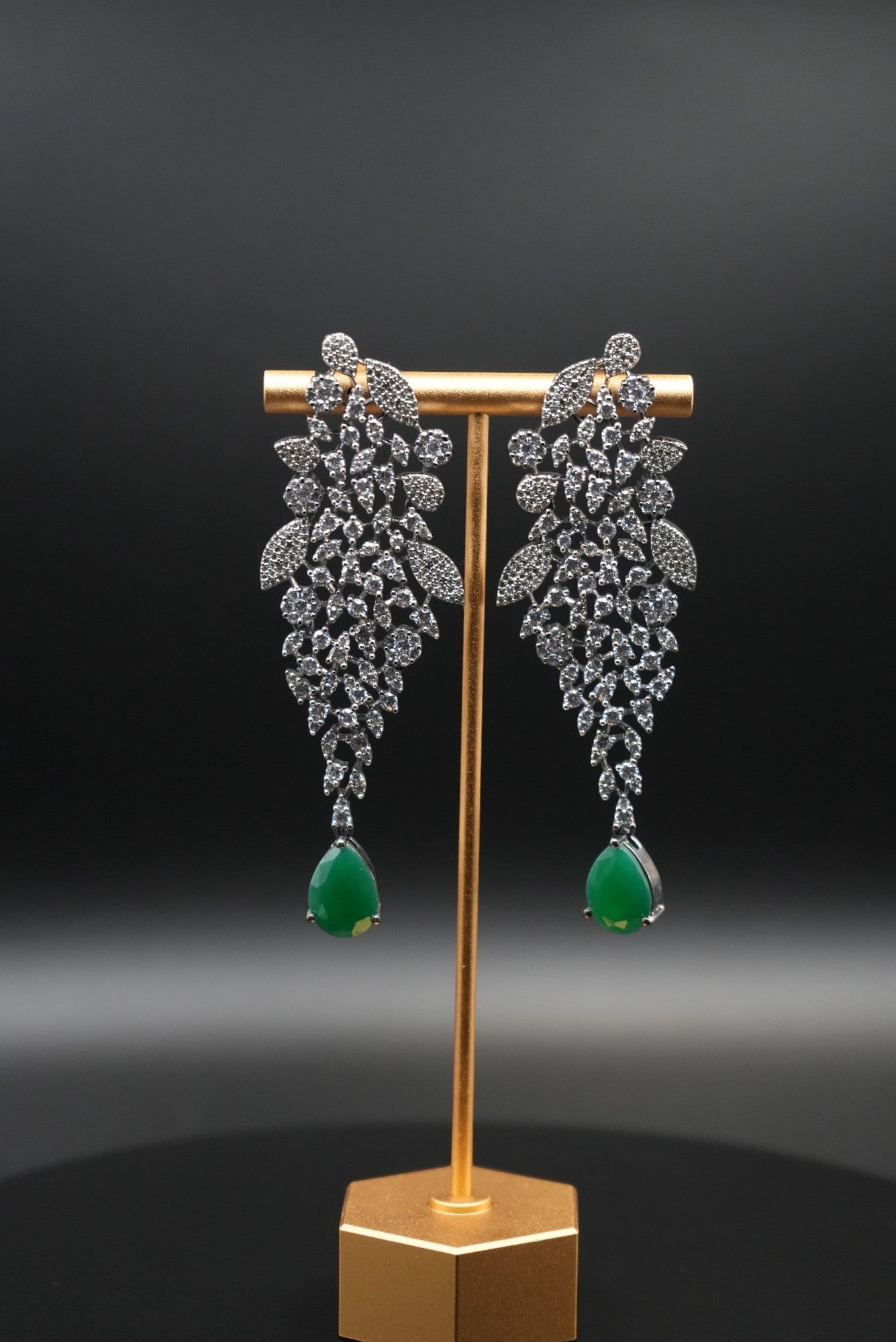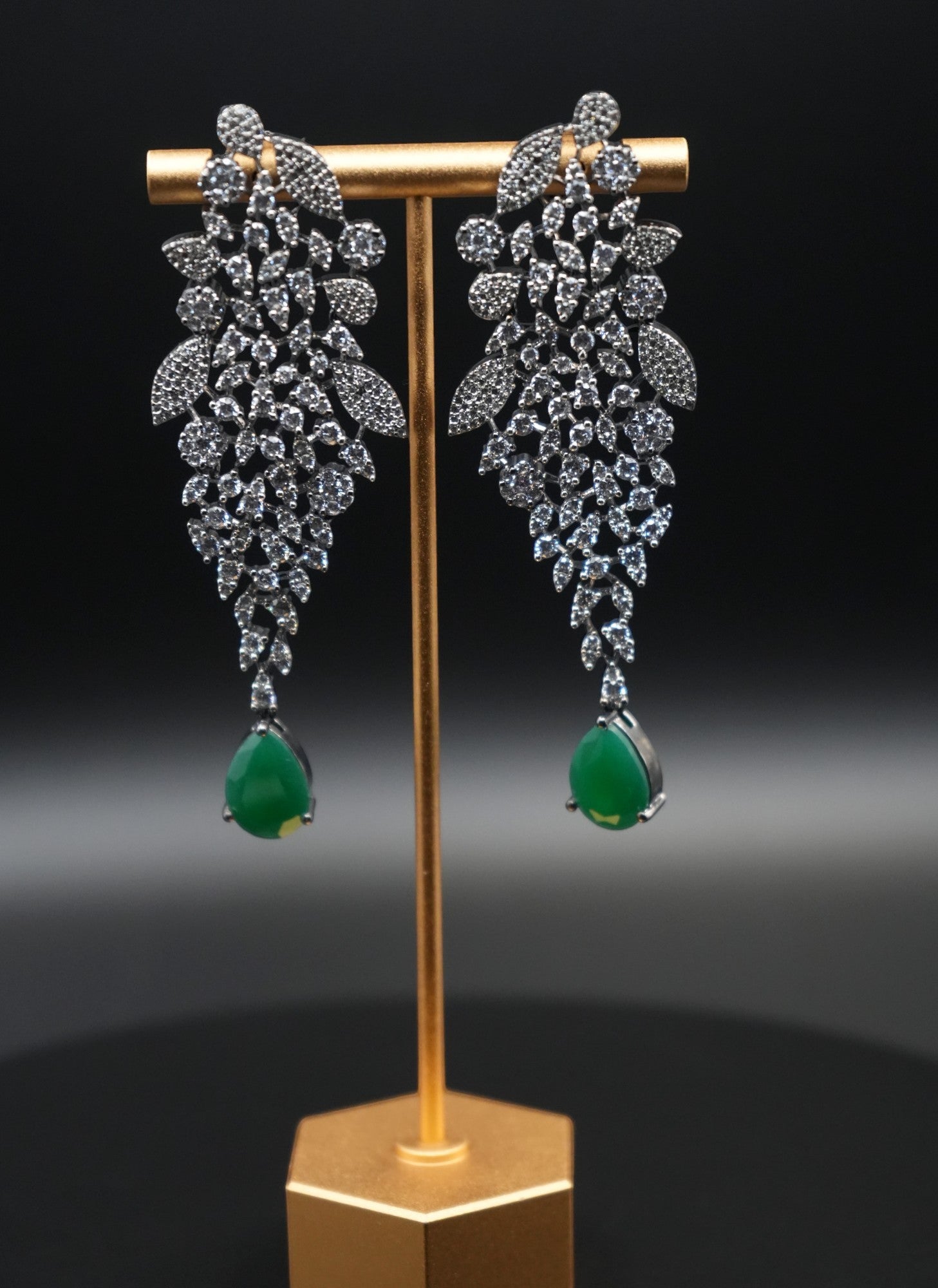 At the base of each earring dangles a beautifully set teardrop-shaped green gemstone, adding a pop of color and a touch of luxury to the overall design. This gemstone enhances the visual appeal, creating a striking contrast with the shimmering silver-tone metal and the clear crystals above.