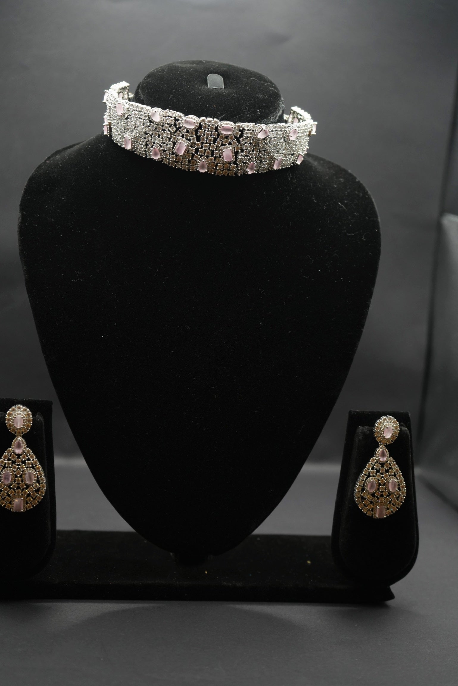 This Stunning Lustrous Jewel choker features a wide band design, crafted with delicate filigree patterns and adorned with light pink oval gemstones. The intricate details create a luxurious and sophisticated appearance. The gemstones are surrounded by sparkling micro-pavé accents, enhancing their brilliance.