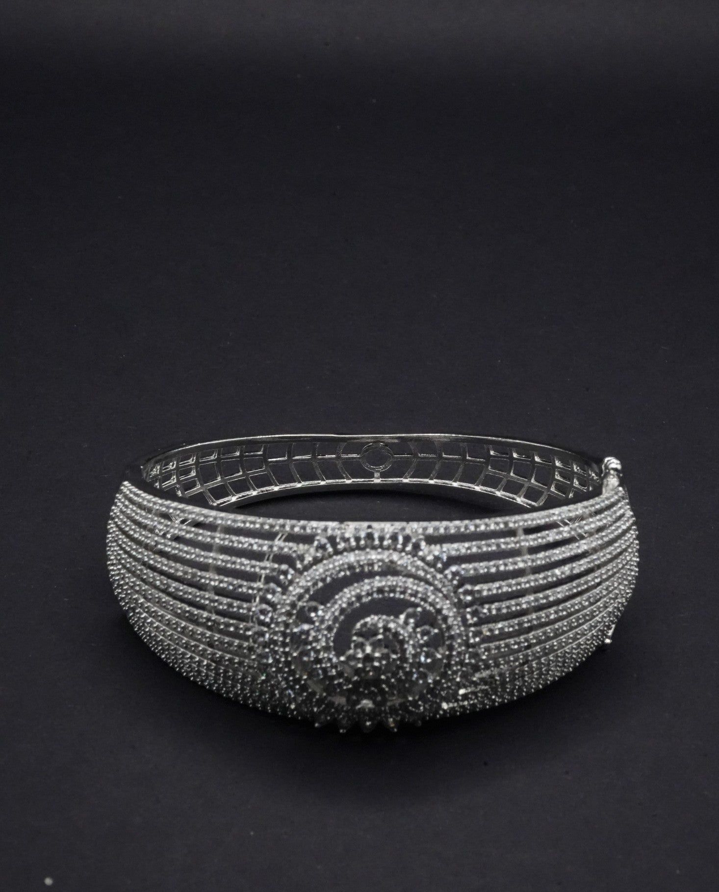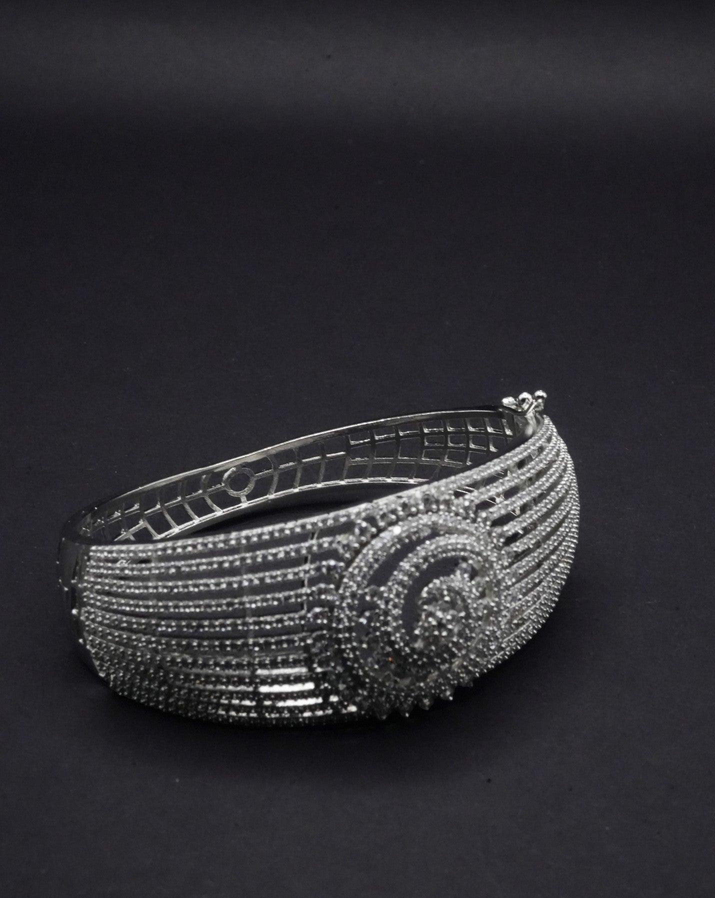 This dazzling silver coated bangle is a masterpiece of modern jewelry design, featuring a mesmerizing combination of spiral and linear crystal patterns. Ideal for those who love to make a statement with their accessories, this bangle is sure to catch the eye with its intricate detailing and brilliant sparkle.