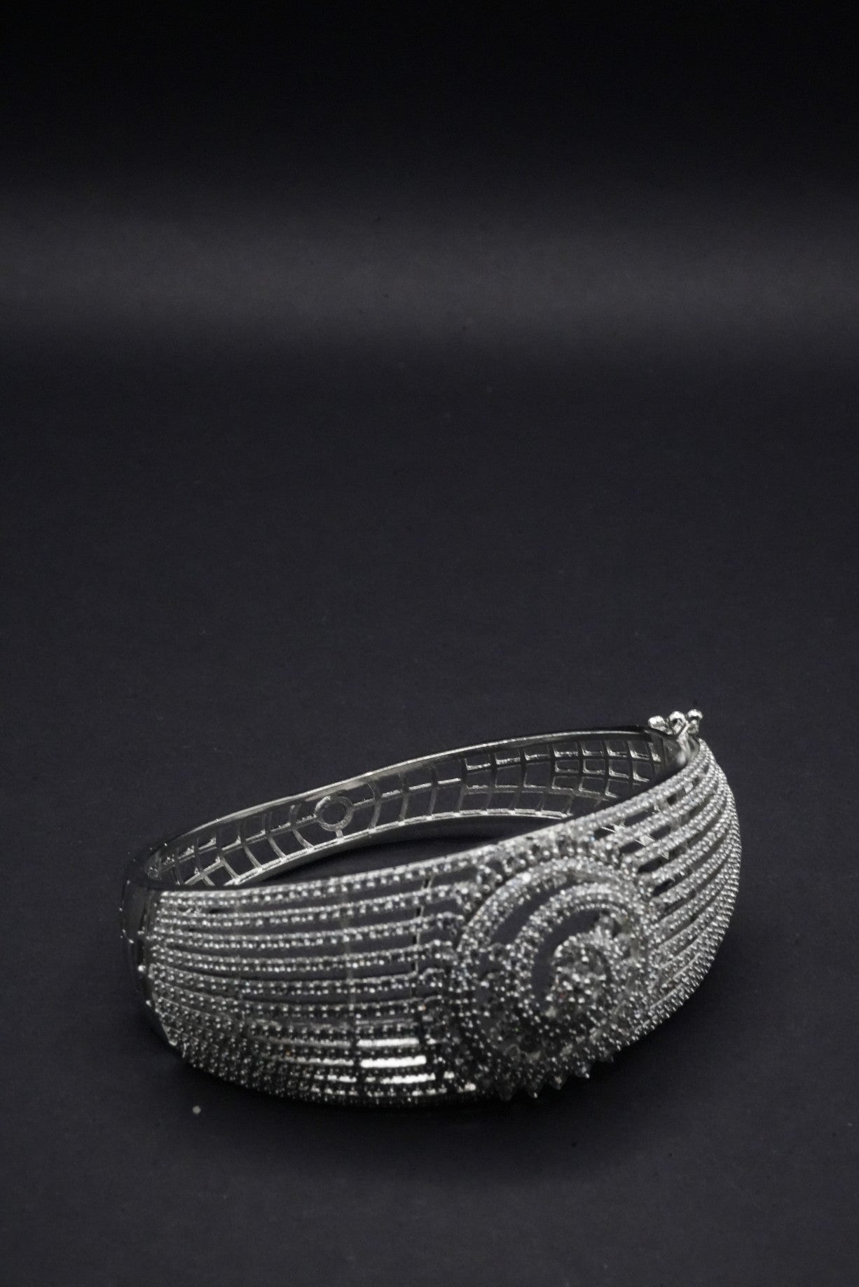 Stunning Silver coated Bangle with Intricate Spiral and Linear Crystal Design