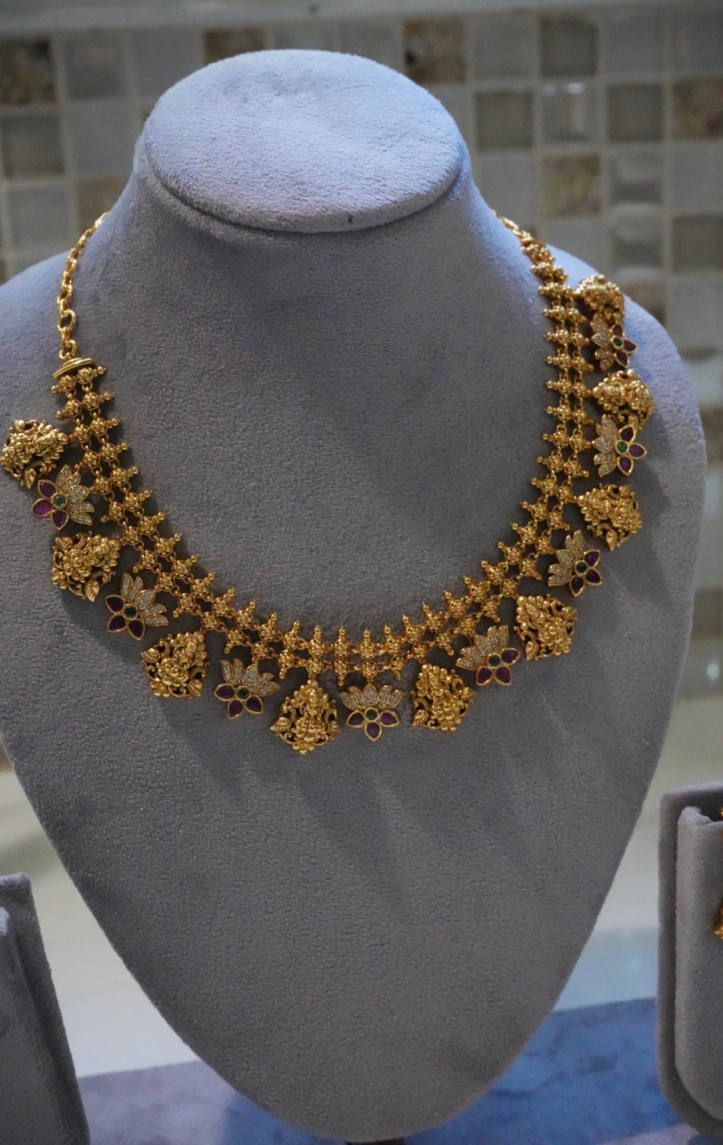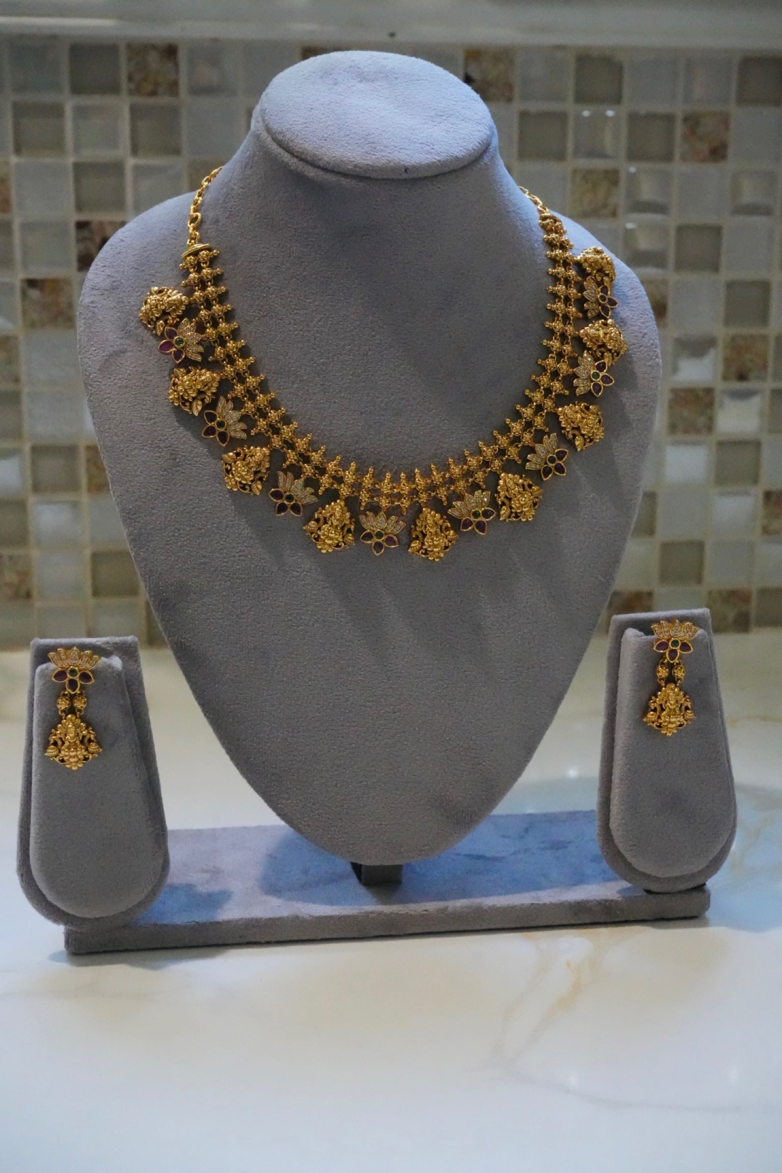 This exquisite gold-toned necklace set features intricate beaded chains and ornate floral or traditional motifs, accented with subtle red stones. Complete with matching dangling earrings, it embodies classic elegance and rich cultural design.