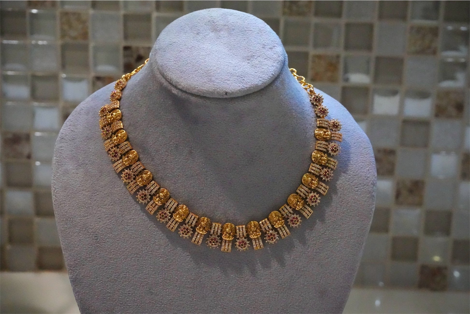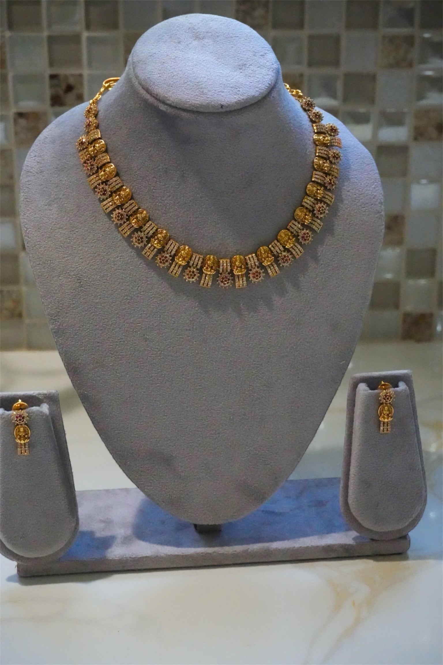 This elegant jewelry set features a meticulously crafted gold-toned choker necklace and matching stud earrings. The necklace design consists of multiple rows, with the top row appearing as small, textured gold beads or links, and the bottom row showcasing repeating traditional motifs, possibly stylized floral elements or deities, with subtle embellishments. The entire set exudes a classic, rich, and ornate aesthetic, commonly found in traditional South Asian jewelry. The gold tone is warm and radiant, suggesting it is either gold-plated or gold-coated, designed to provide the luxurious look of solid gold. This set is ideal for festive occasions, weddings, or adding a touch of cultural elegance to any ensemble.