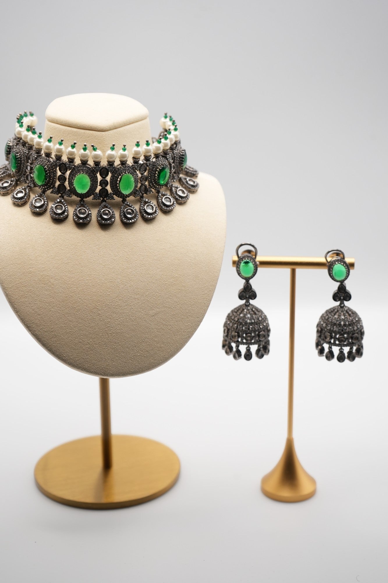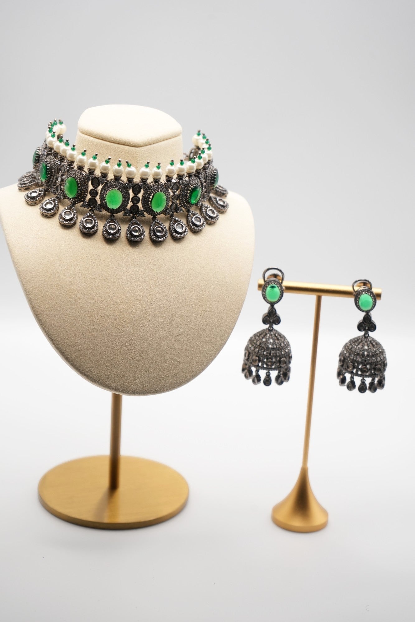 - Design: A series of larger, bezel-set green gemstones serve as the central focus, flanked by smaller, similarly set stones and pearls. Each major gemstone is linked by intricate silver filigree work, leading to a fringe of teardrop-shaped motifs, each encapsulating a gemstone and completed with a dangling pearl.