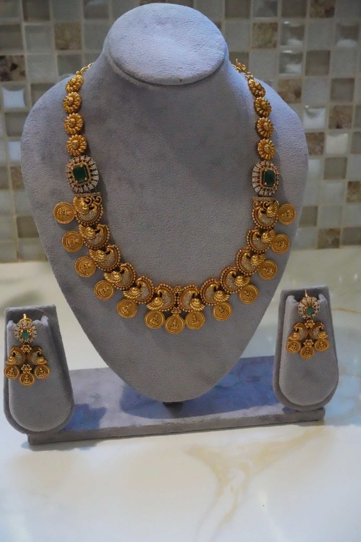 Traditional Green Stone & Gold Peacock Coin Necklace Set