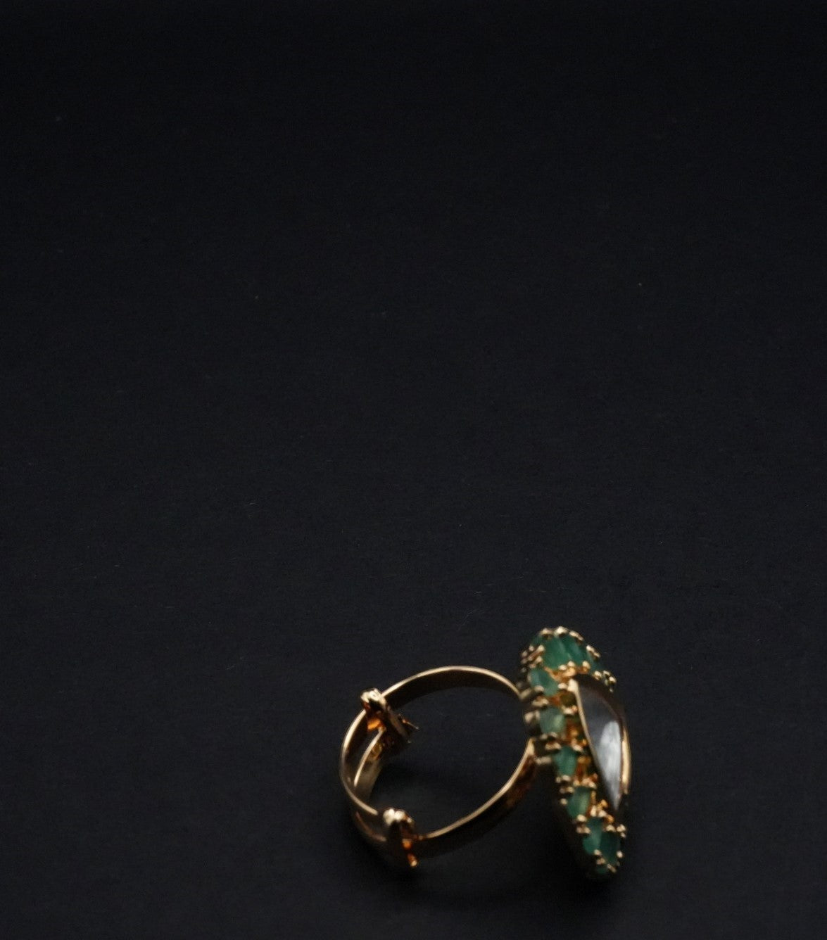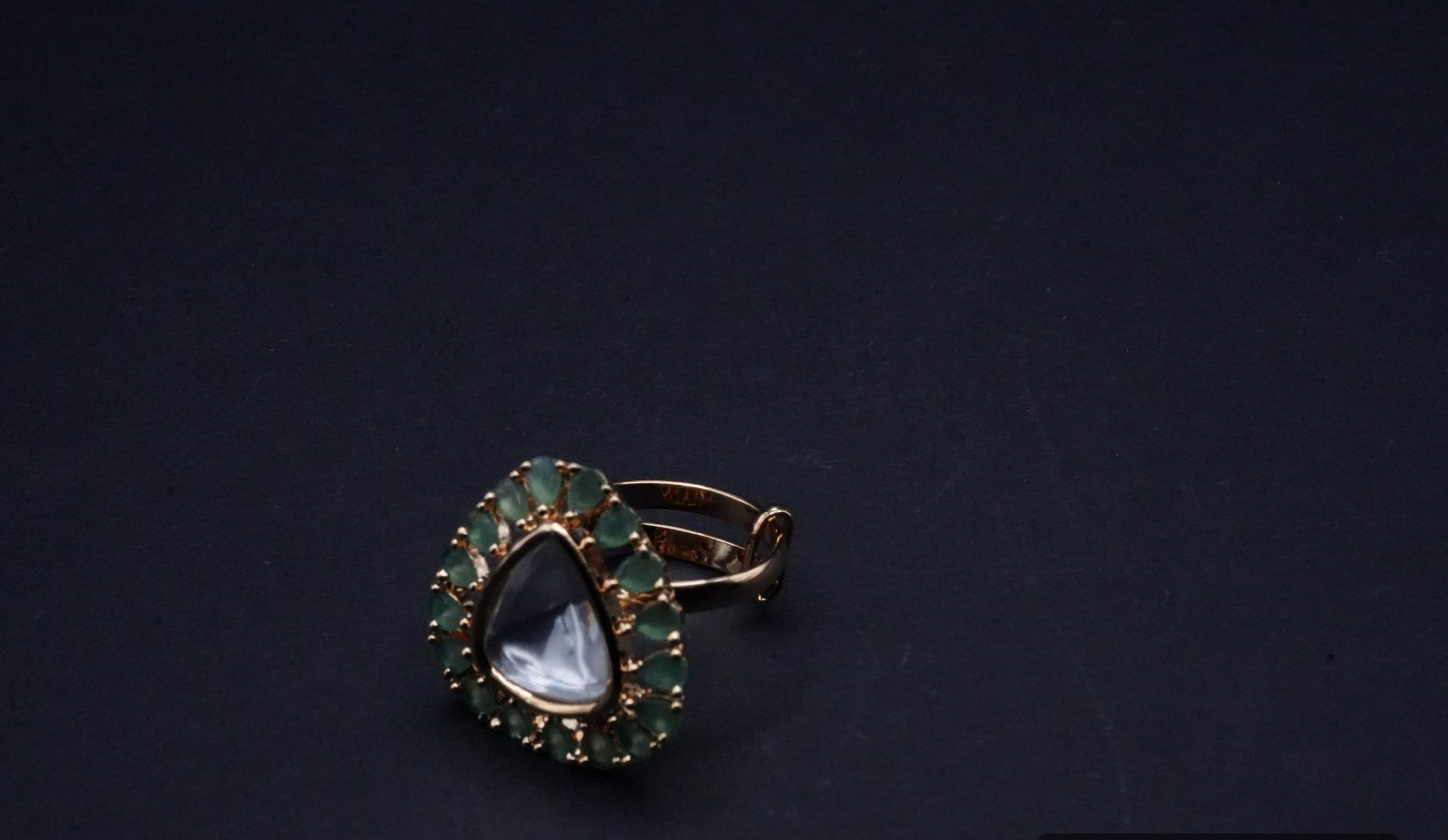 This elegant triangular statement ring, featuring a beautiful combination of clear and green stones, offers a unique and refined design that’s perfect for special occasions or elevating your everyday look. The intricate detailing and geometric shape make this piece a standout accessory in any collection.