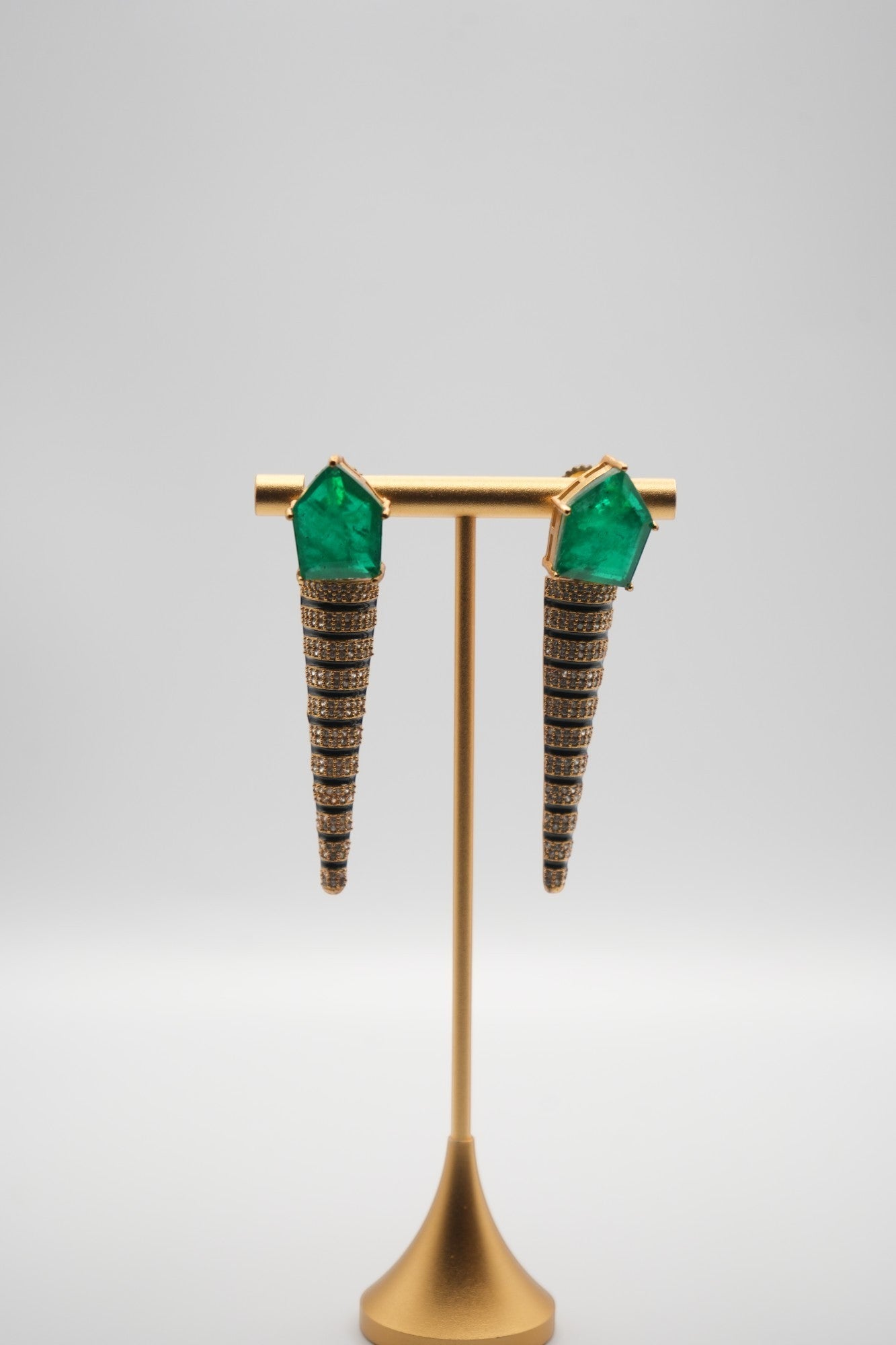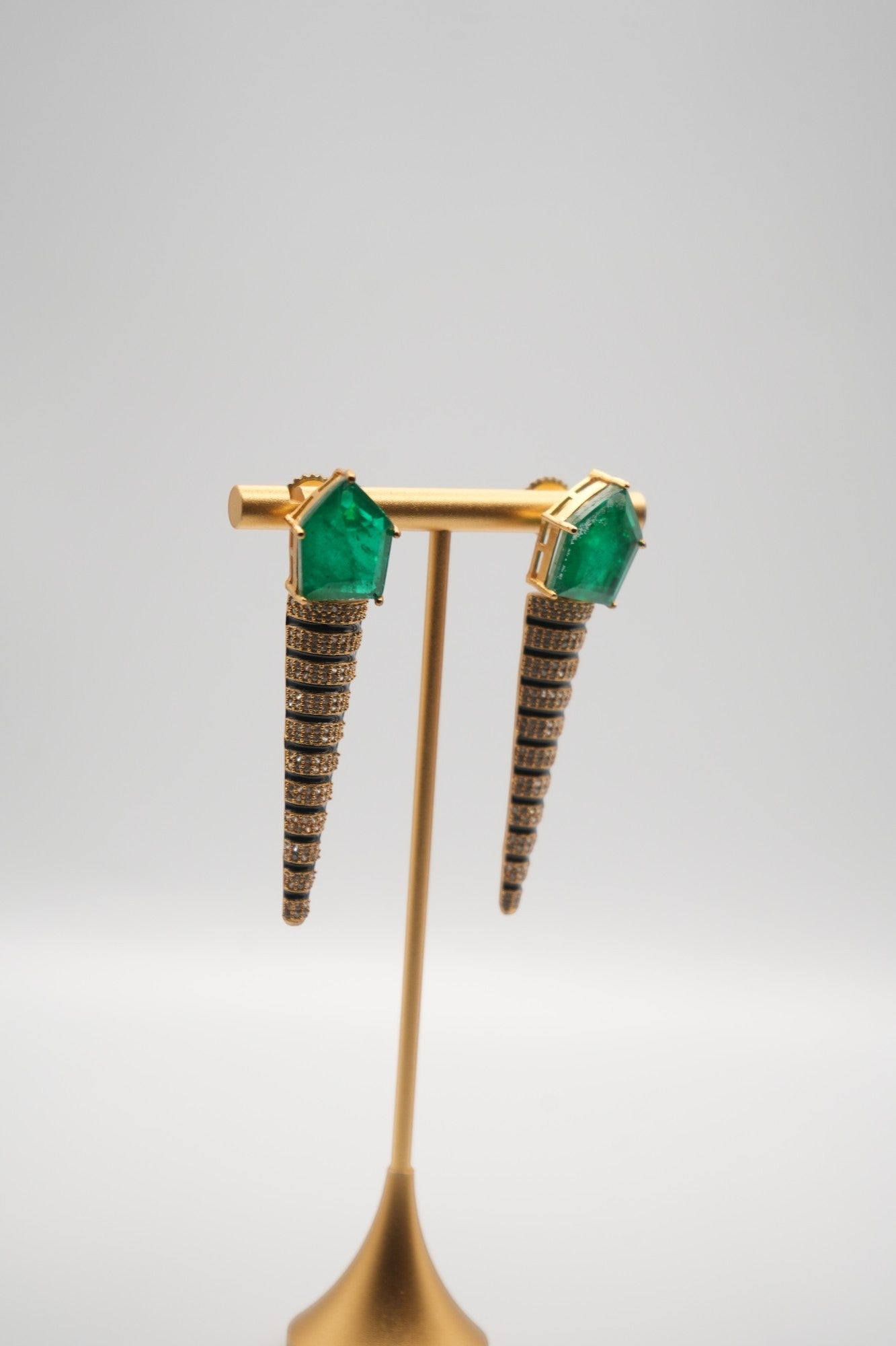 Make a bold and sophisticated statement with the "Verdant Spire" Earrings. These unique earrings feature a striking, elongated conical design, crowned with a vibrant emerald-green gemstone and adorned with intricate, textured gold-toned detailing. Inspired by architectural forms and the rich color of emeralds, these earrings exude a modern yet luxurious charm, perfect for adding a touch of distinctive elegance to any occasion.