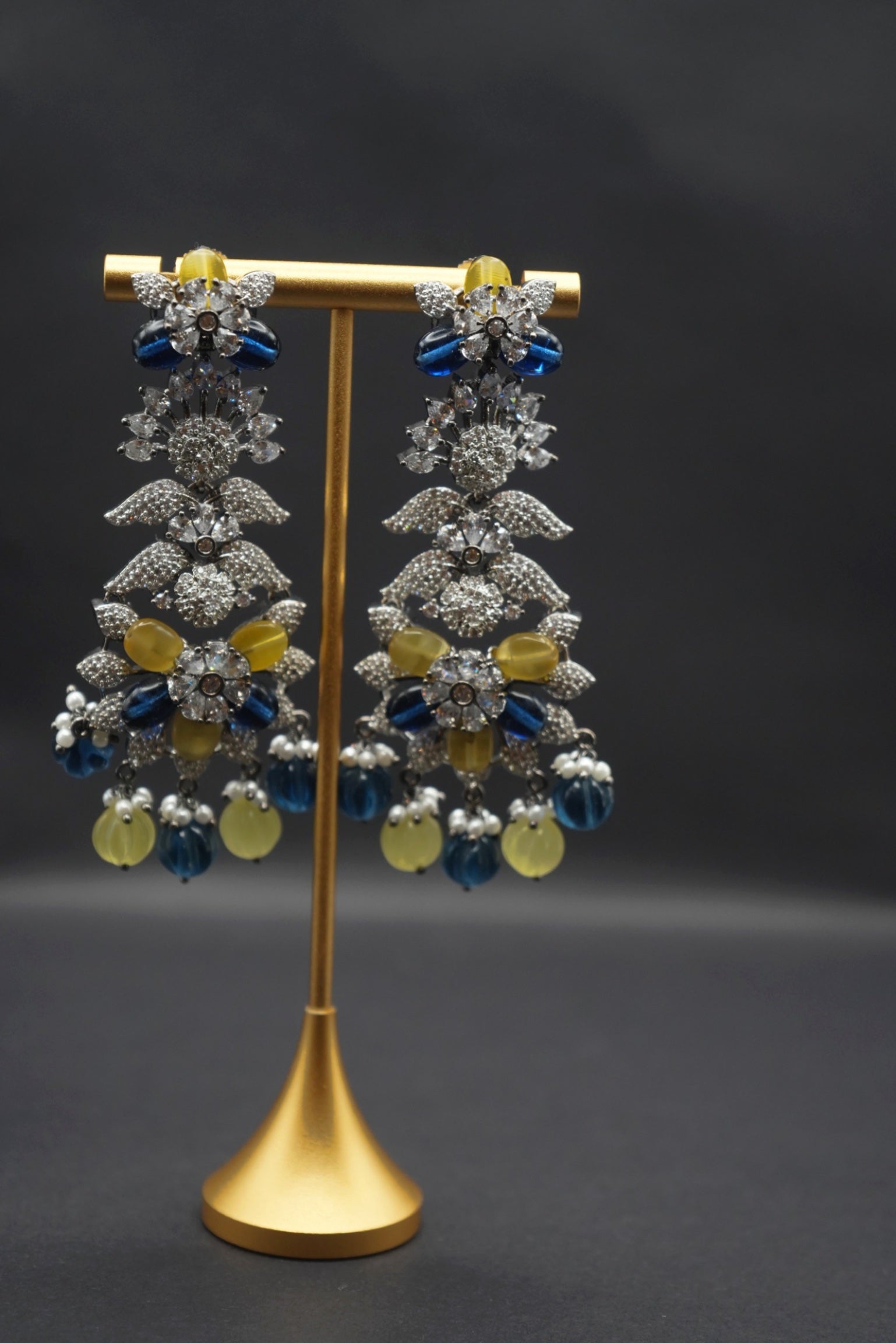 The earrings are meticulously crafted with a layered design. Each tier features a combination of blue and yellow crystals, creating a visually stunning contrast. The crystals are of various shapes and sizes, adding depth and texture to the earrings. The design culminates in a playful drop of faceted blue and yellow beads, providing movement and a touch of whimsy. The silver-toned metal setting enhances the vibrancy of the crystals.